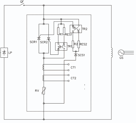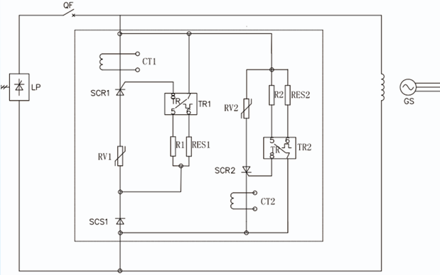 As can be seen from the diagram, by adding SCS1 and SCR1, the nonlinear resistor is turned off under normal operating conditions, limiting the leakage current. The selection of R and RES1 is determined based on the design calculations of the overvoltage set value.
